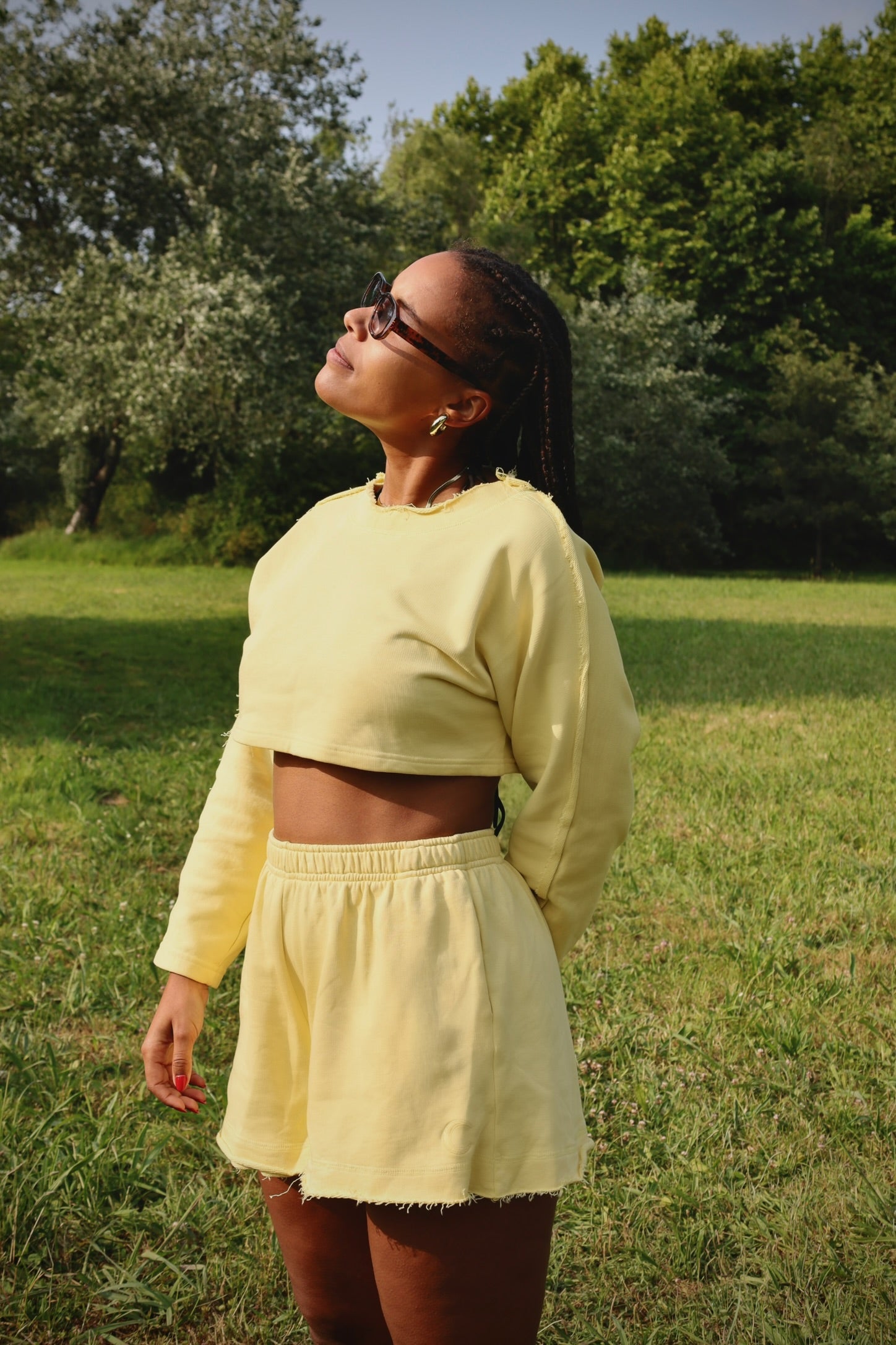 The buttery pastel yellow brings instant joy. Like golden hour on your skin.
